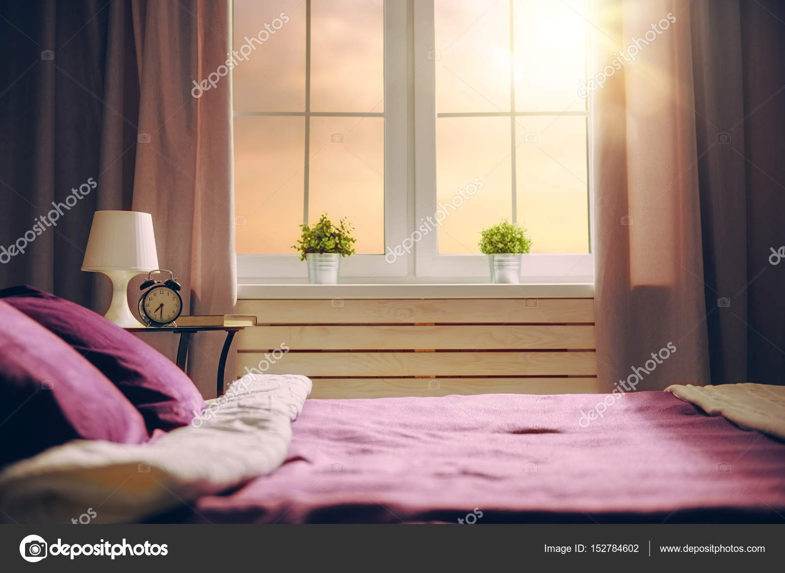 Gemutliches Schlafzimmer Innenraum In Lila Tonen Stockfoto